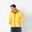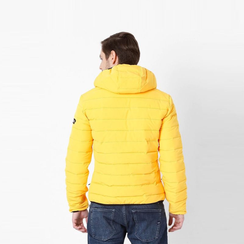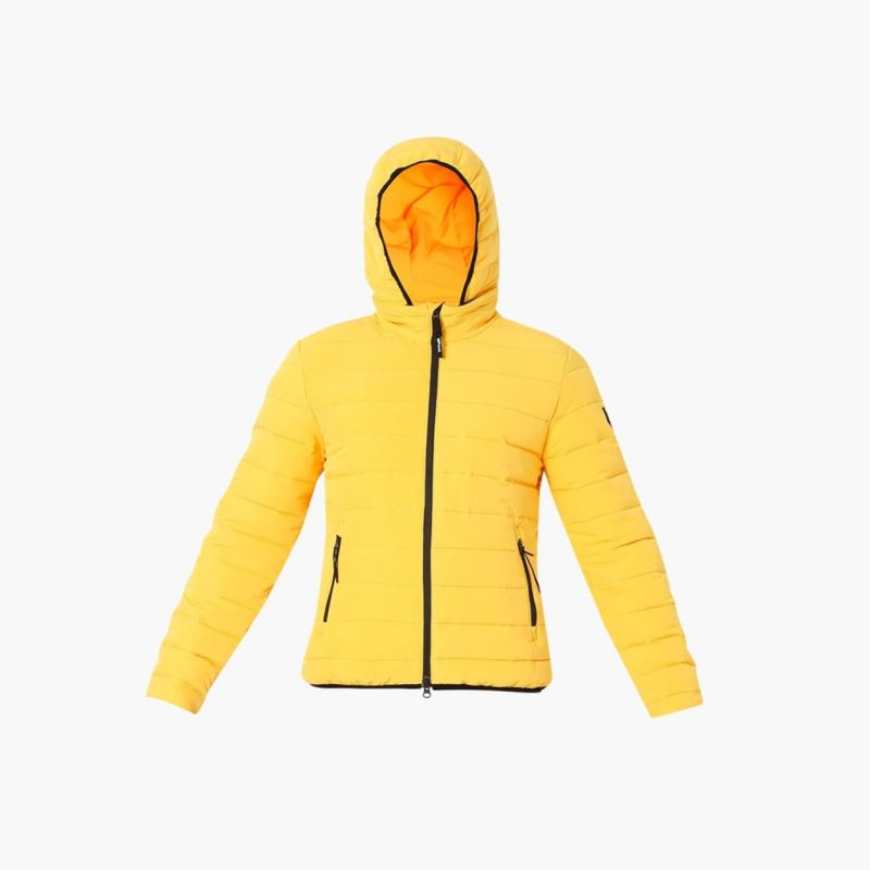 سترة منتفخة مخططة باللون الأصفر ، لديها غطاء رأس ، جيوب 2 ، لديها إغلاق بسحاب ، أكمام طويلة ، حاشية مستقيمة ، بطانة من البوليستر.