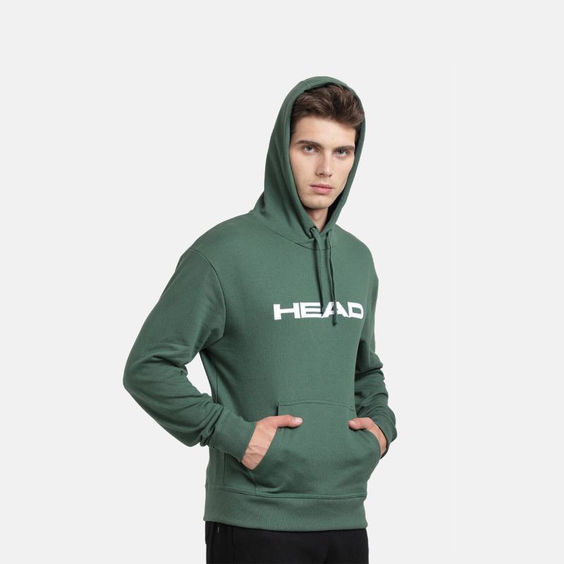 Green solid sweatshirt has a hooded, 1 kangaroo pocket pockets, long sleeves, closure, ribbed hem.
