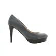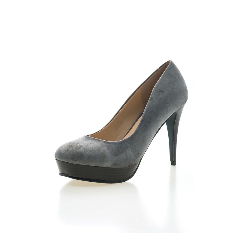 A pair of Grey solid pumps ,has regular ankle and closed back Synthetic solid upper Cushioned footbed Textured and patterend outsole, has a slim heeled