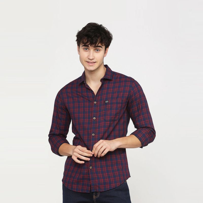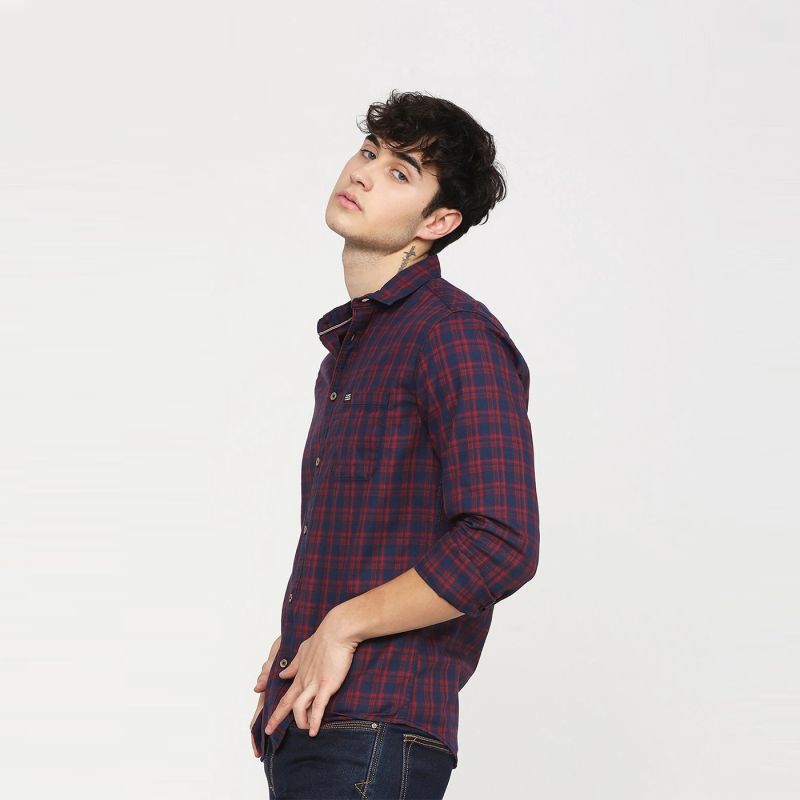 Maroon and Navy Blue checked casual shirt, has a spread collar, long sleeves, button placket, curved hem, and 1 patch pocket.