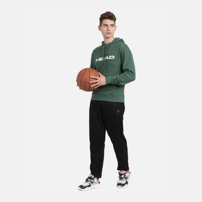 Green solid sweatshirt has a hooded, 1 kangaroo pocket pockets, long sleeves, closure, ribbed hem.
