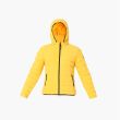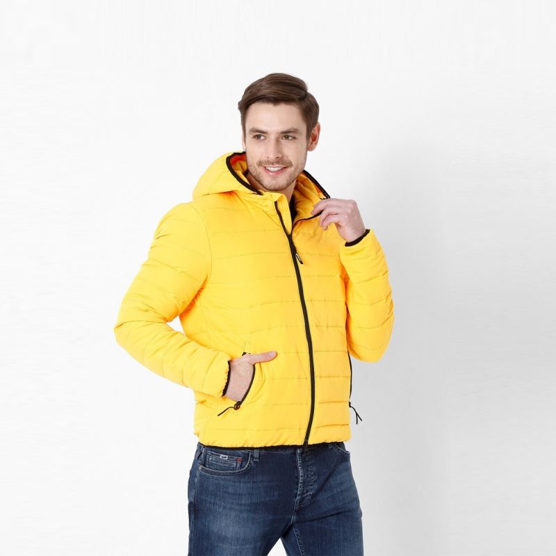 Yellow striped puffer jacket, has a hooded, 2 pockets ,has a zip closure, long sleeves, straight hemline, polyester lining.