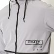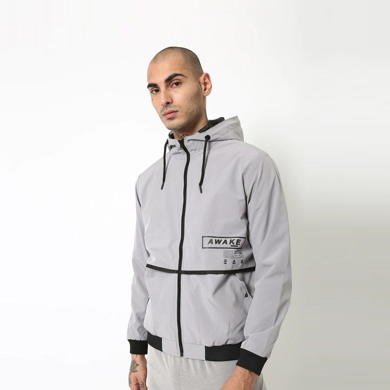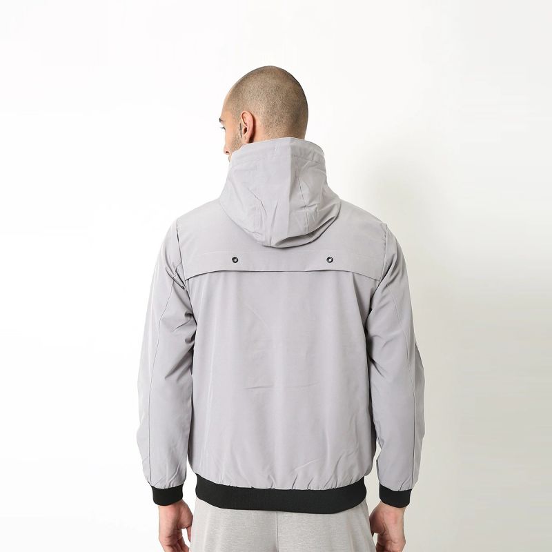 Grey solid open front jacket, has a hooded, 2 pockets ,has a zip closure, long sleeves, straight hemline, polyester lining.