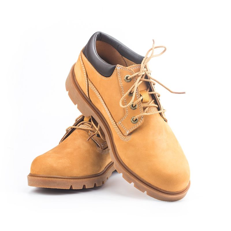 A pair of round-toe Yellow Boots, has regular styling, lace-up detail
